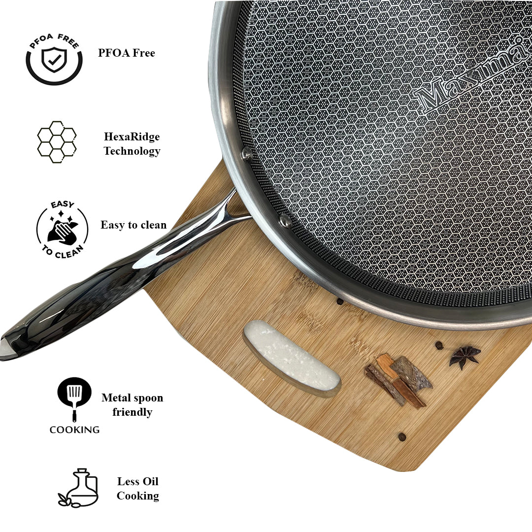Low-Oil Consumption: The Maxim brand's one-of-a-kind non-stick honeycomb structure makes sure that you always use less oil and thus cook helpful healthy and delicious recipes in low oil.