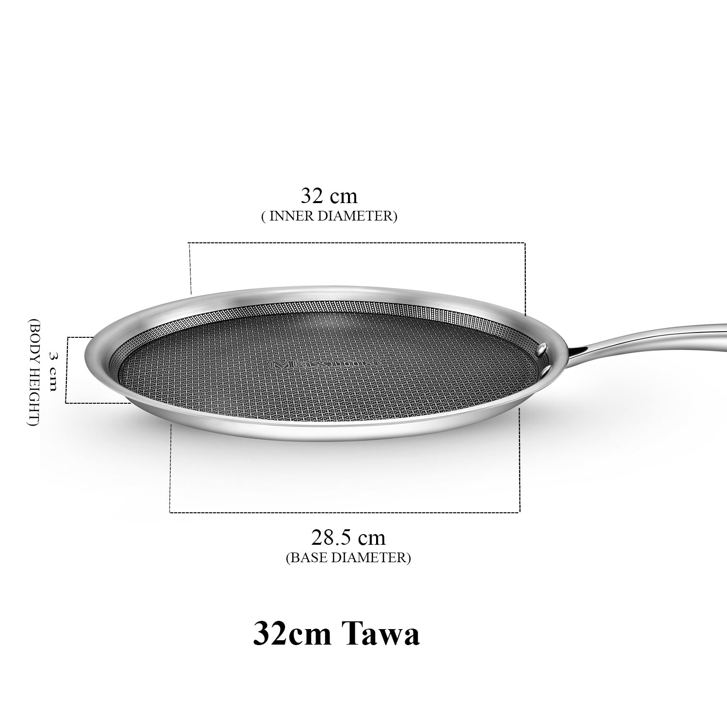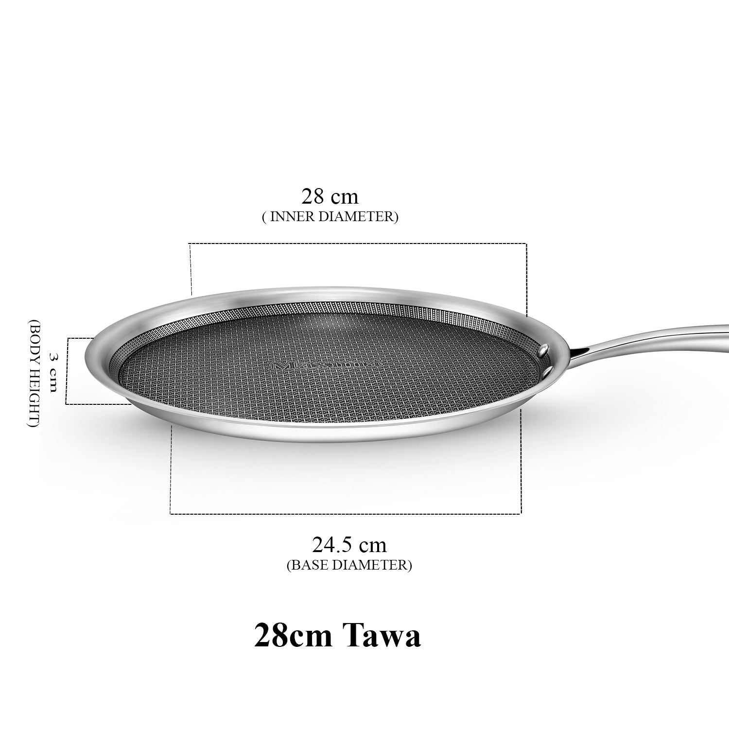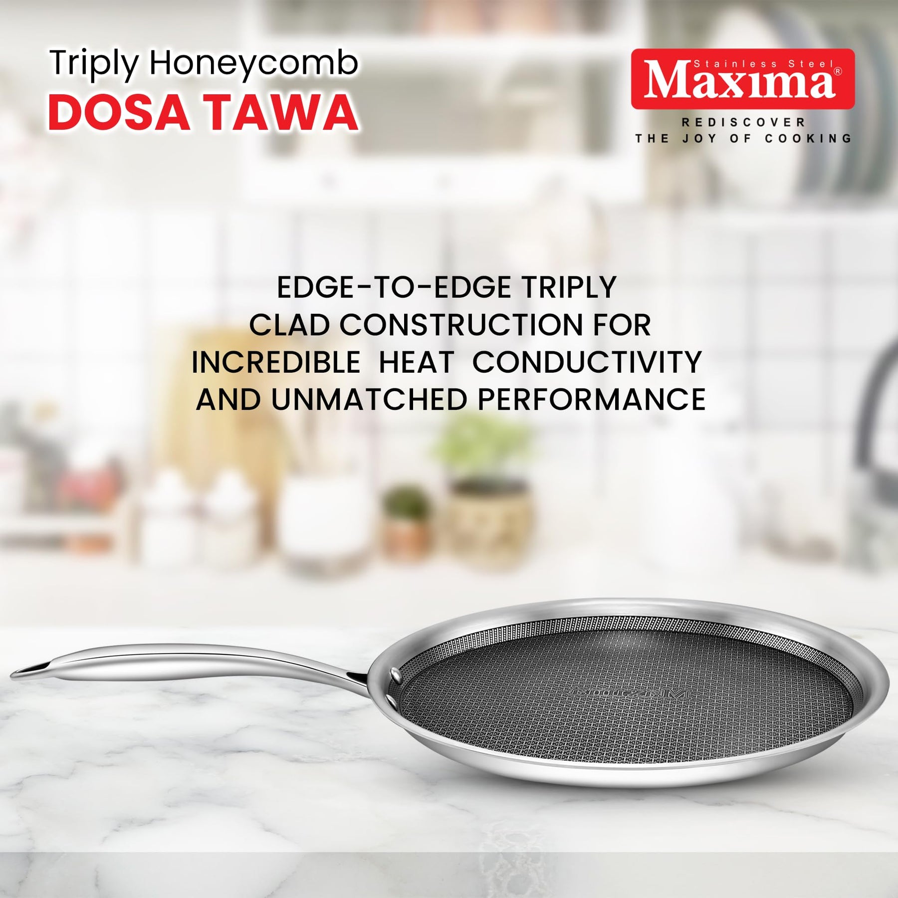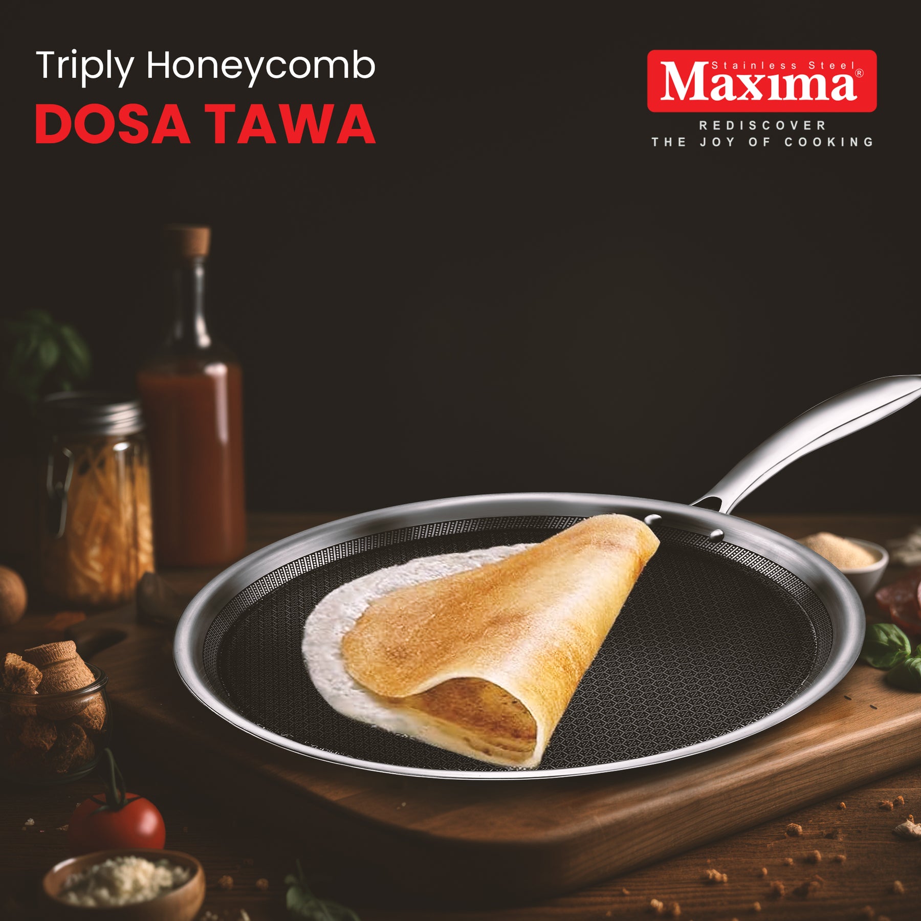 Maxima Tri-Ply Honeycomb Dosa Tawa: The unique Tri-Ply cookware range combines the properties of both aluminum and stainless steel. The stainless steel ensures healthy cooking while the aluminum provides even heating. The superior honeycomb non-stick structure absorbs friction making it extremely scratch-resistant and making cooking almost oil-free.
