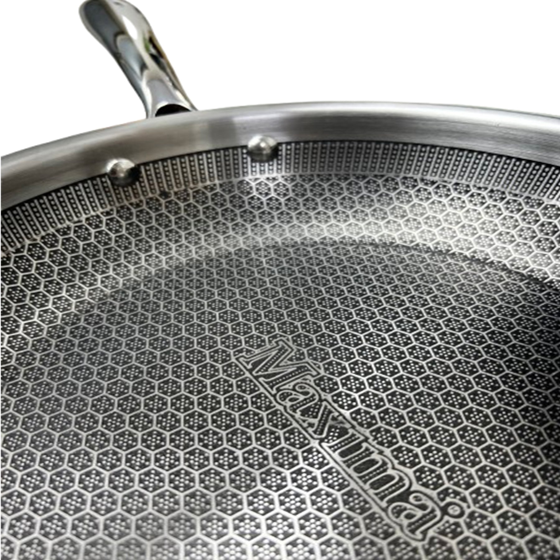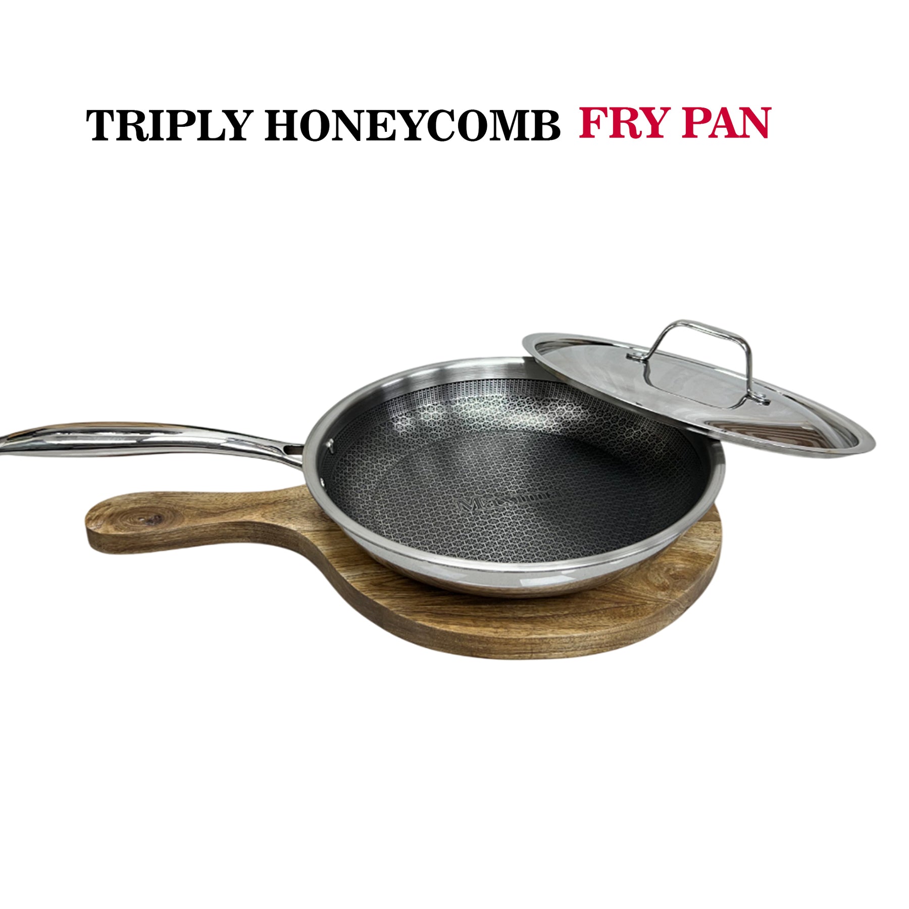 The maxima tri-ply Honeycomb Fry pan has been made from triply material, which is three layers sandwiched through the whole body of the pan. This provides an experience impossible to achieve with a standard stainless steel pan. The stainless steel lid helps cook food three times faster than standard stainless steel cookware. Stay-cool handles make it easier to move the pot from one location to another. The versatile design can be used to fry, steam, saute, boil, or stew. All cooking ranges are compatible - Gas Stoves, Induction, and Coil.